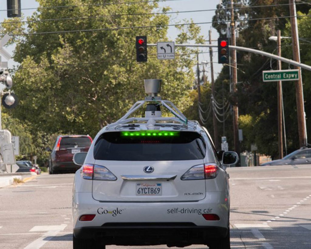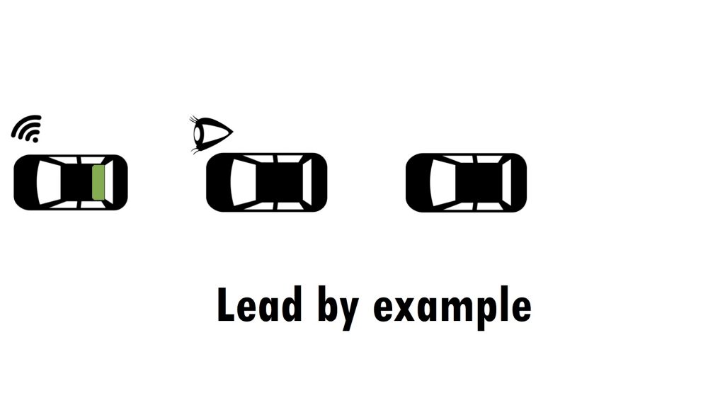 This photoshopped image shows how we envision our prototype: a self-driving car is driving to a red light, but indicates that if you stay behind it you don’t have to brake for the red light.