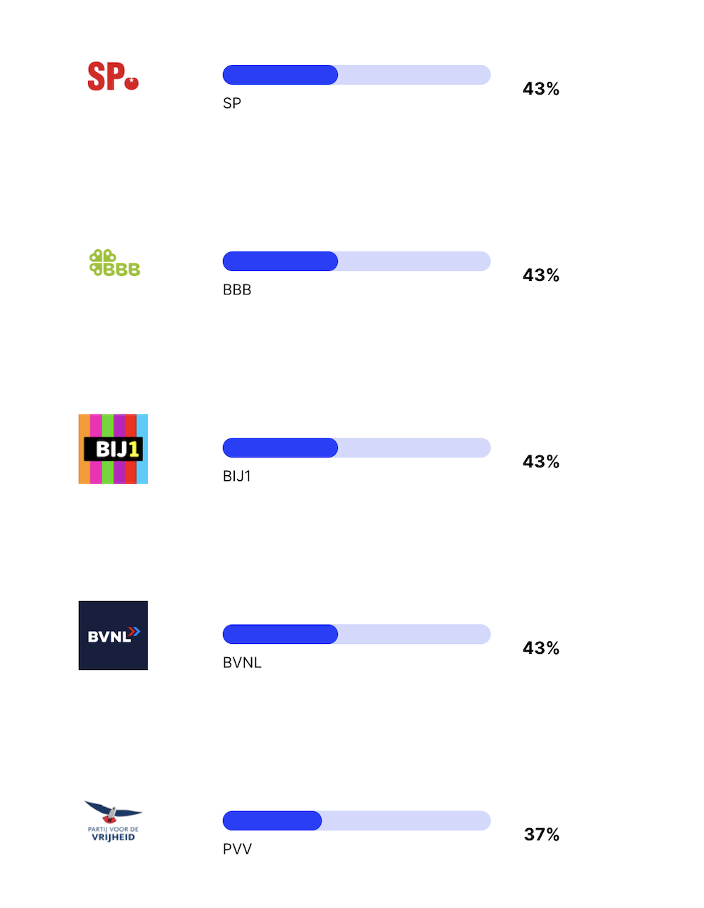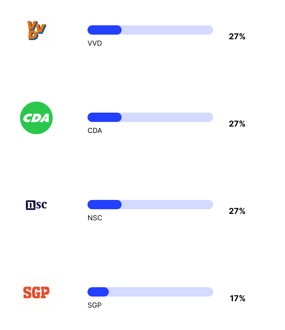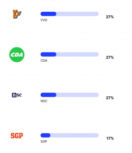 En als laatste komen enkele grotere partijen die nu aan de macht zijn of in de regering zitten. Waarom deze partijen zo laag staan weet ik niet zeker, omdat je zou verwachten dat een taalmodel de âhuidige stand van de wereldâ zou moeten leren. Een van mijn hypotheses is dat mensen online meer klagen over zittende partijen en dat het taalmodel hiervan geleerd heeft. Deze hypothese sluit echter niet aan bij de lage score van de nieuwe partij van Pieter Omtzigt, die juist erg populair lijkt op het internet.