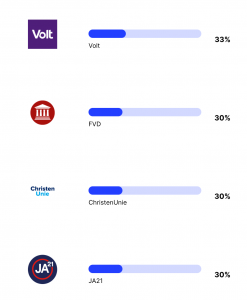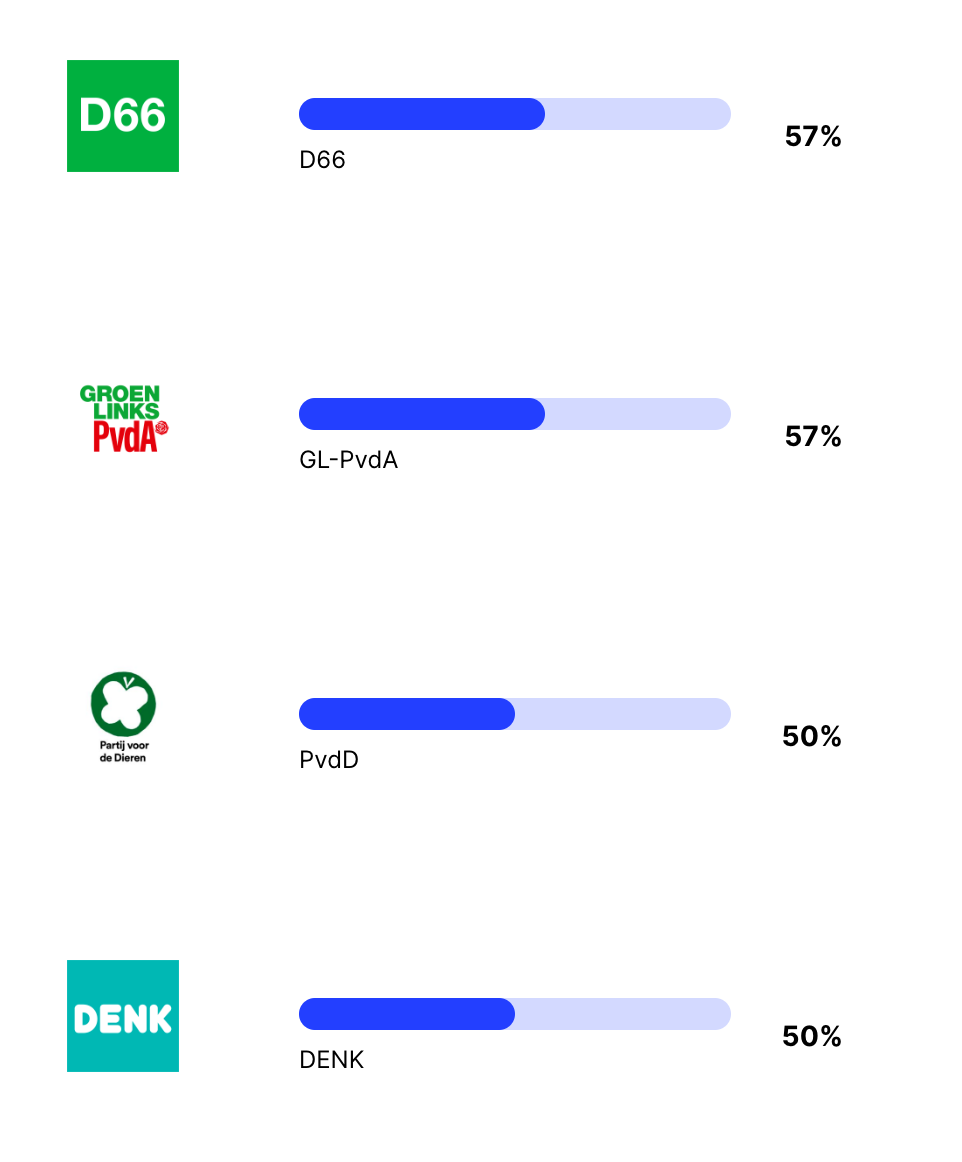 GPT-3 is erg links progressief. GPT-3 doet er alles aan om vriendelijk te zijn voor alles en iedereen, en vooral voor de natuur. Er zijn vier partijen die 50% of meer overeenkomen met de bias in de mening van GPT-3, dit zijn D66, de GroenLinks/PVDA combinatie, de partij voor de dieren, en DENK.