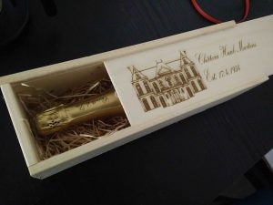 To create a personal gift I decided to create a laser engraved wine box with the favorite wine of my dad. I bought a black wooden wine box at my local liquor store. To create the design I downloaded an image with a “french looking” house on it. Using Inkscape this image was converted to a vector graphic.