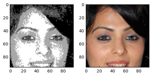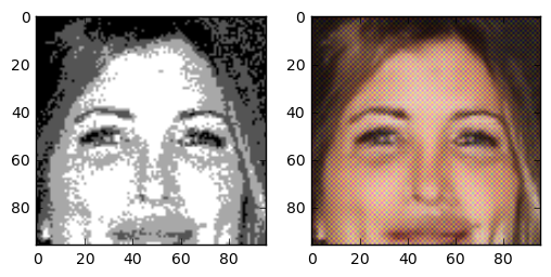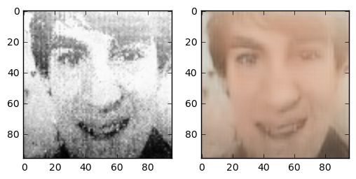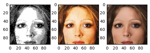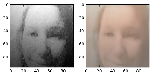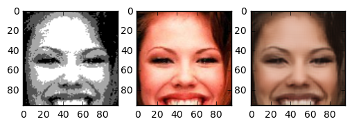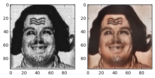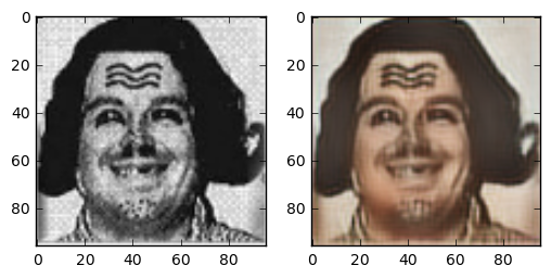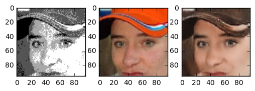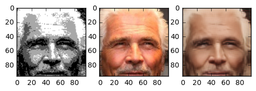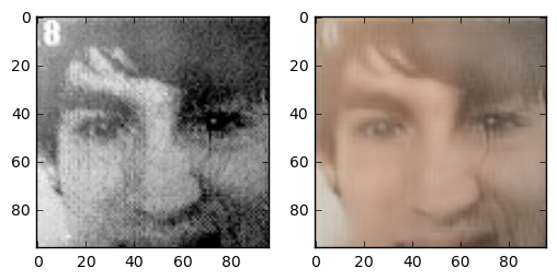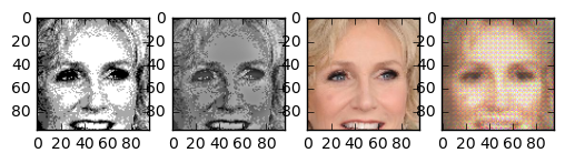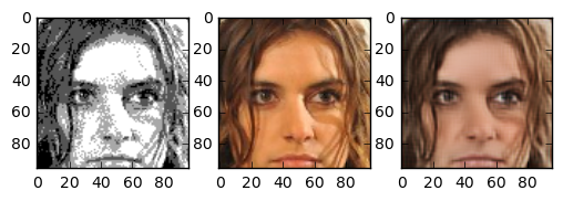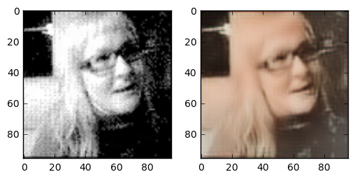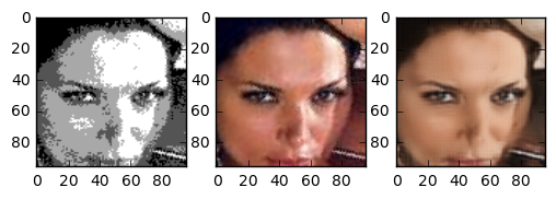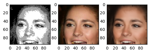 One question I asked myself was: how does this task compare to coloring sketch images? The details of the face are very blurry, but the outline of face details is still preserved. Because the areas between features are filled with 4 colours, the network has more grasp on what the resulting colour should compared to the line sketch problem. One interesting thing is that this network gives the right skincolor to people most of the time.