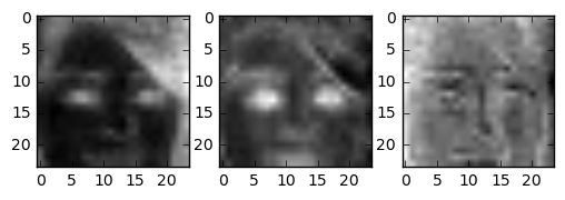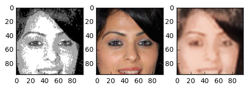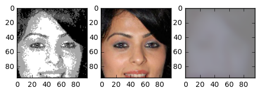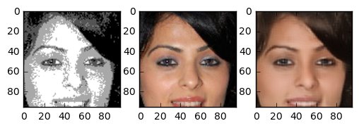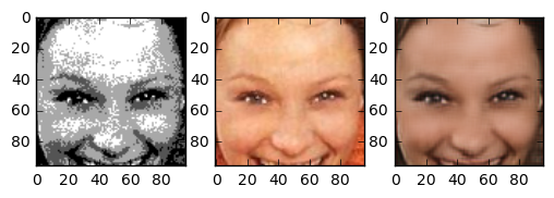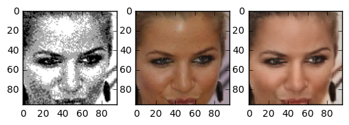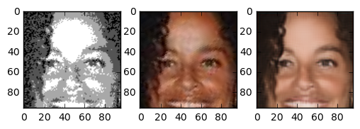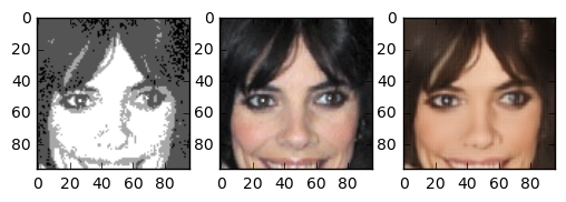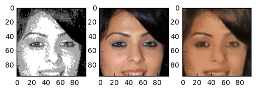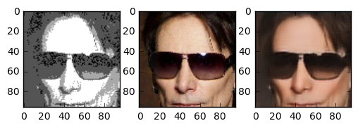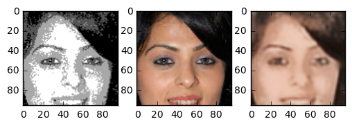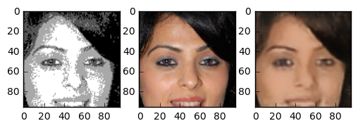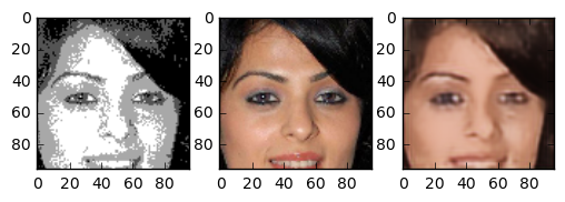 In the end the result turned out very good. The generated images are really great. Although we trained on a small part of the face even pictures of whole heads seem to turn out nice. The following images are images the network has never seen before. The image in the center is the “real image”, the image on the right is generated by our neural network. Note that even skincolor is accurate most of the times.