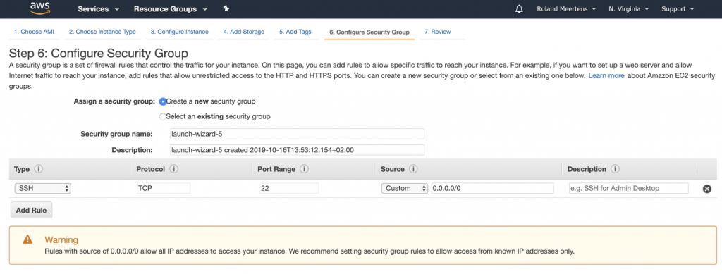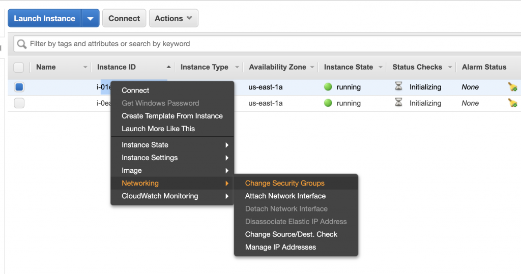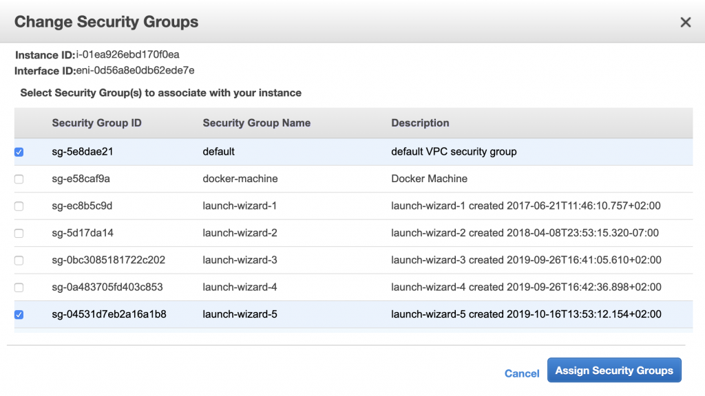 Launch your instances! Now that they are running it’s time to edit them directly. For horovod you apparently need more than only SSH-access. Select your instances one by one and add them to a security group which allows inbound traffic from all instances in the same security group. For me this was the default security group.