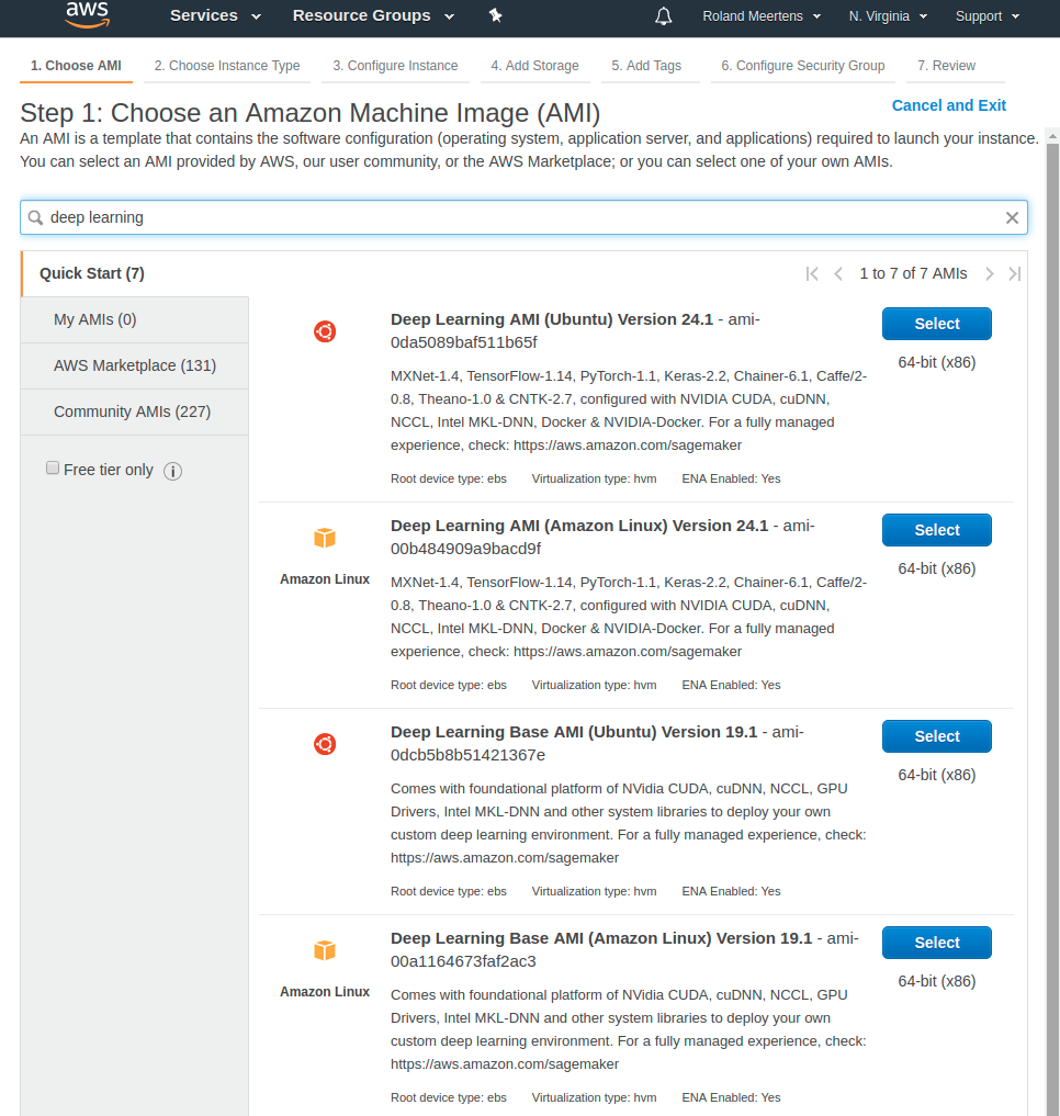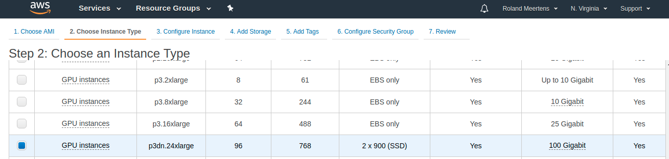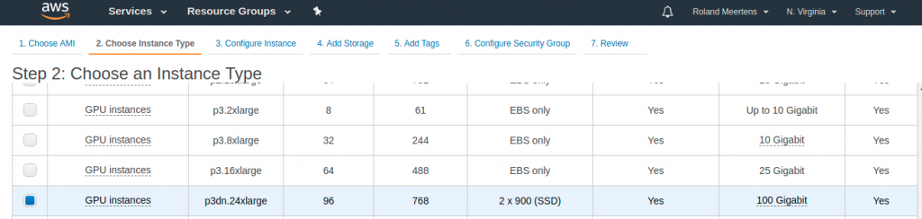 Next you can select the specific instance you want to have. You can find an overview of the GPU instances and their capabilities here: https://docs.aws.amazon.com/dlami/latest/devguide/gpu.html. Note that having more GPUS will speed up your training, but will also be more expensive. I recommend trying to start with one GPU and trying to fully use that one. Once you can do that try to fill 4-8 GPUs to their full capacity. Once you finished that you can move on to the final challenge: scale your training across multiple machines.