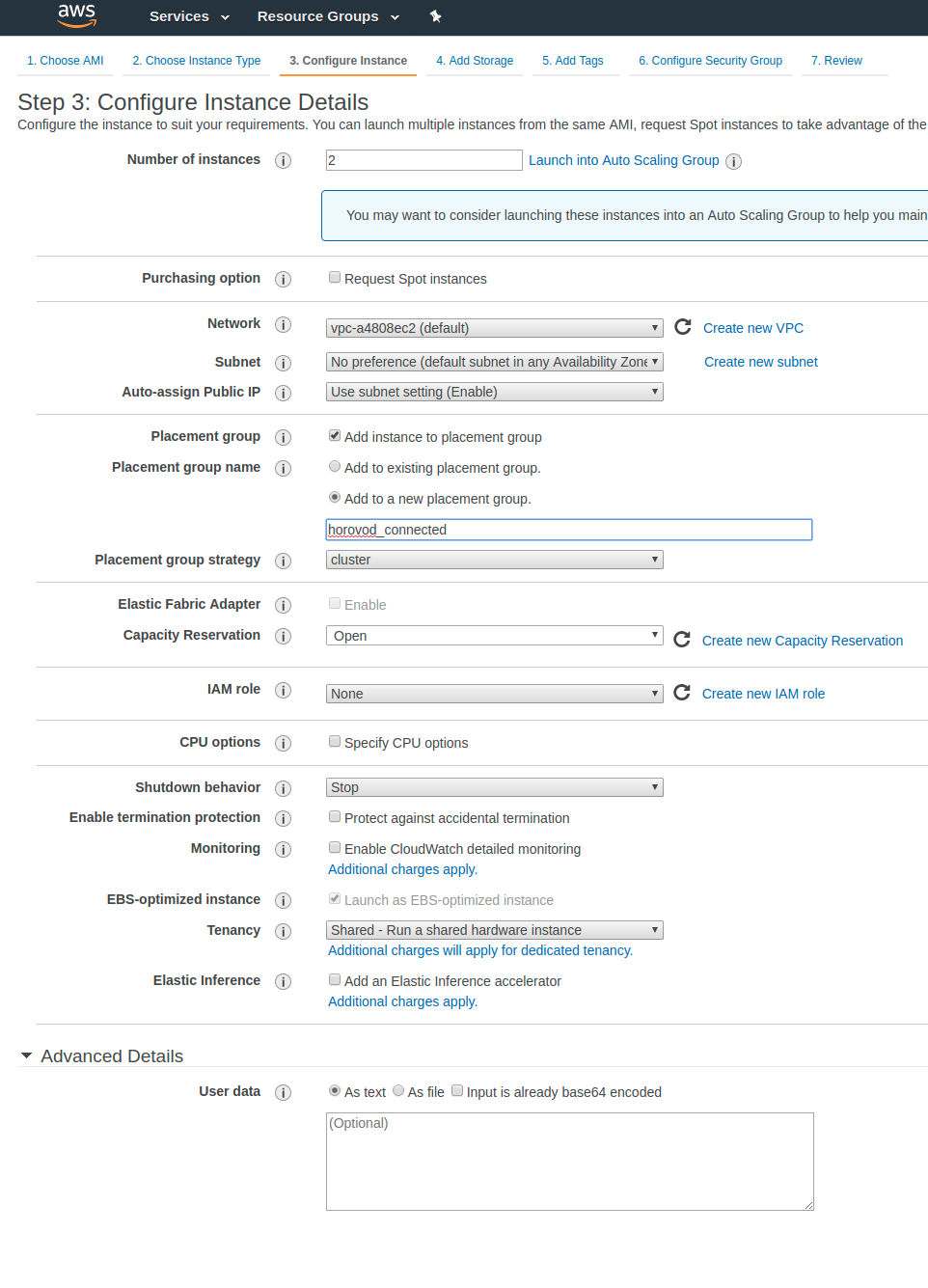 Next you can configure the instance details. I case you are interested in scaling your machine learning algorithm across multiple instances this is the moment where you can select how many instances, and where you have to add them to a placement group.