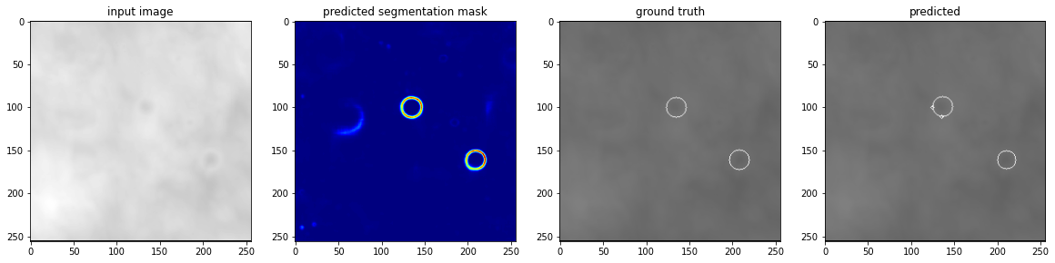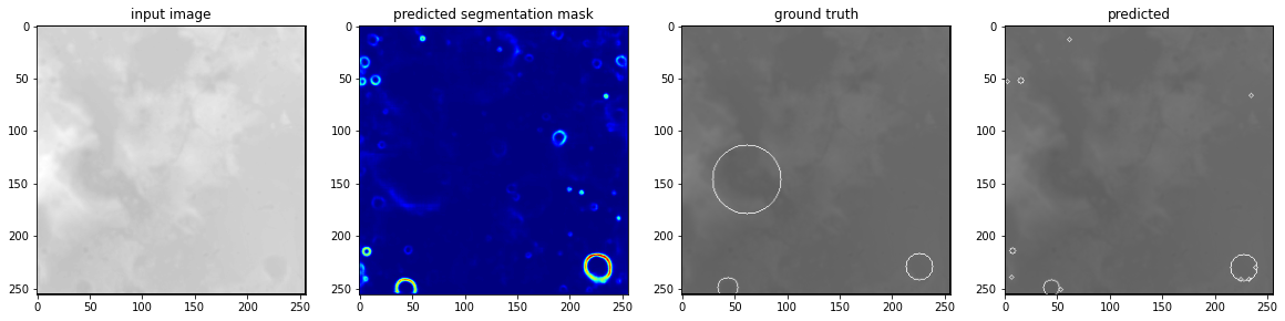 # For a few inputs, show both the input, segmentation mask, ground truth, and prediction.