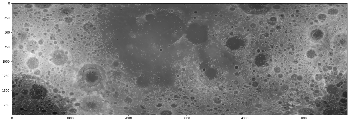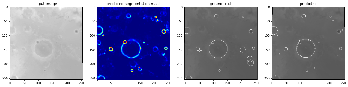 One of available inputs in the DeepMoon dataset is a very large image of the moon. I ran my neural network, and visualised the result for the whole image. Running it takes quite a bit of time, but the result looks really good!