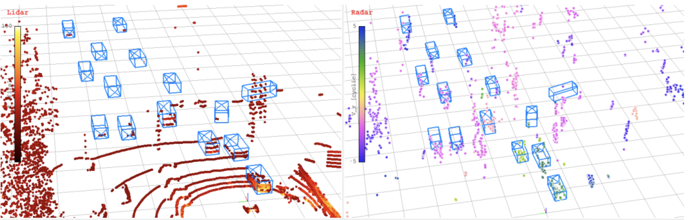 It also contains bounding box annotations of all objects that can be observed by the lidar, camera and radar. This is the visualisation the authors of the dataset use in the paper “Automotive Radar Dataset for Deep Learning Based 3D Object Detection“.