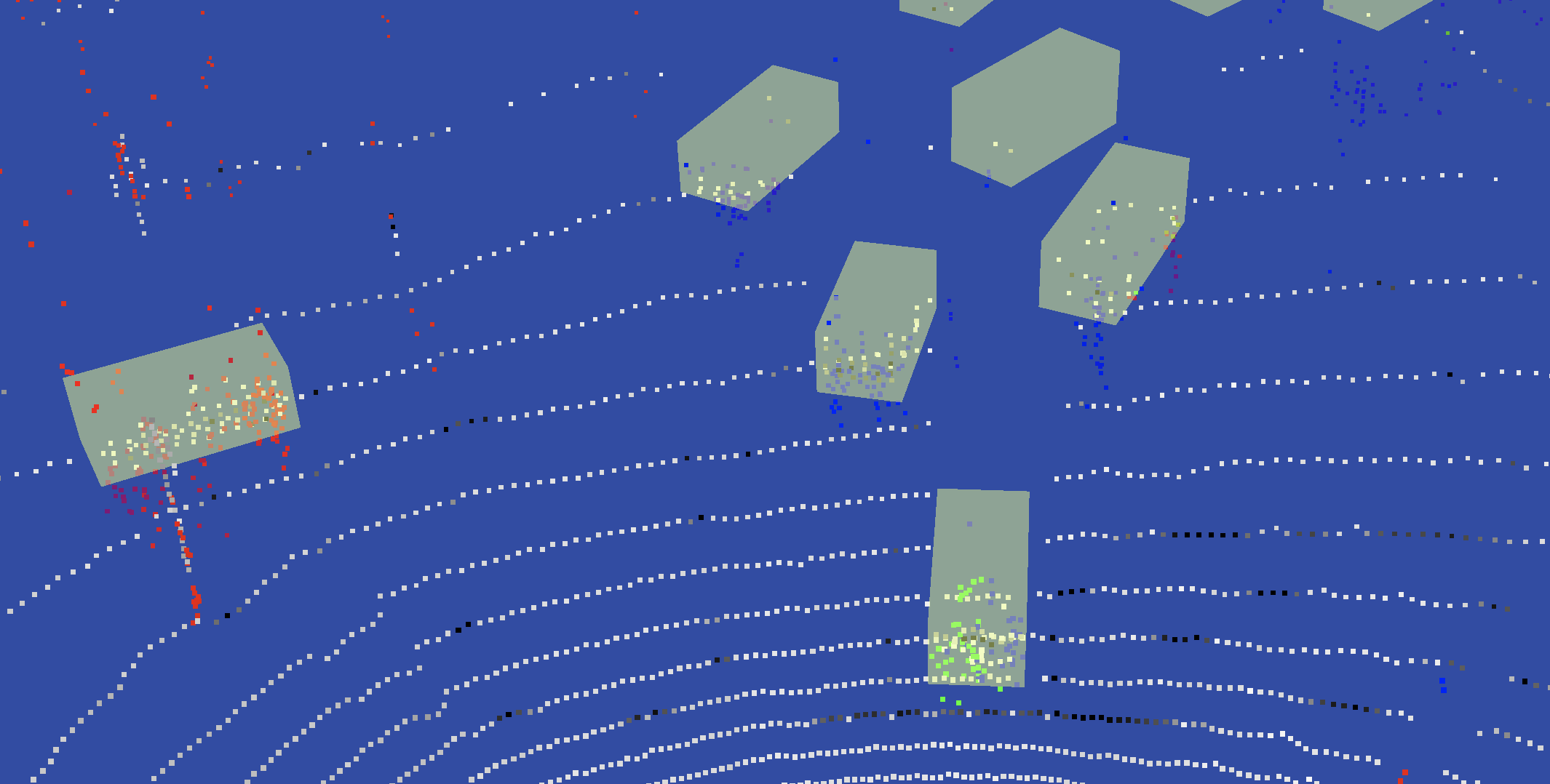 Now that we visualise both lidar and radar frames we can reason about how you can use this for a self-driving car. Although the resolution of the radar is high compared to other radars the lidar sensor still gives more points per objects close to us. With only lidar you can still see what kind of object something is (traffic light, car, pedestrian) while this is harder based on only this radar data. However, at further distances the radar really starts to shine. Objects that are farther away have more hits by the radar than by the lidar. There are also some cars which don’t get hit by the lidar at all, but the radar makes it clearly visible that there is a car there. What’s also really nice is that radar allows you to better estimate whether something is moving or not. For self-driving cars non-moving (static) objects don’t pose any risk, as long as you don’t drive into them. However, moving objects, regardless of what they actually are, require extensive attention to figure out what they are, what they will likely do, and require the car to plan a path around them. In the visualisation you can find some objects which only have a few hits by the lidar, but the radar shows that they are moving, and thus are important for the self-driving car.